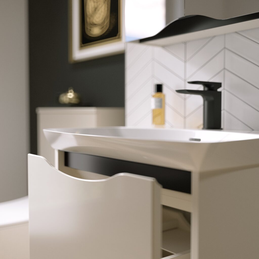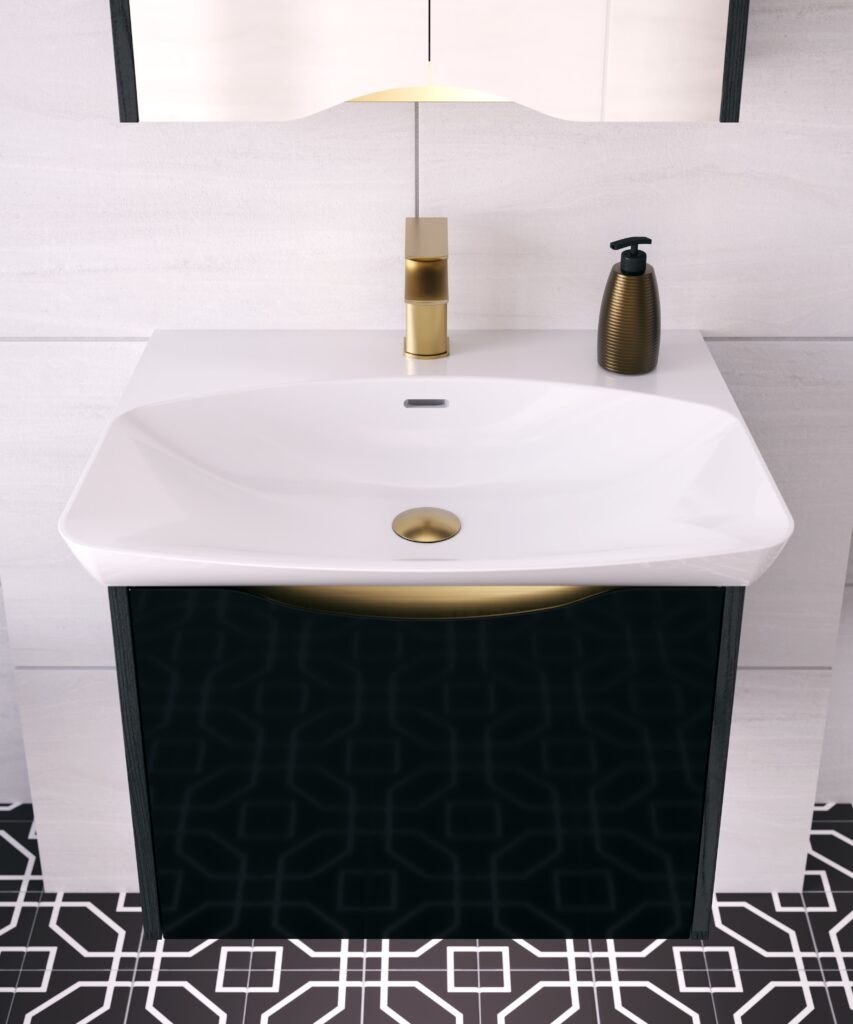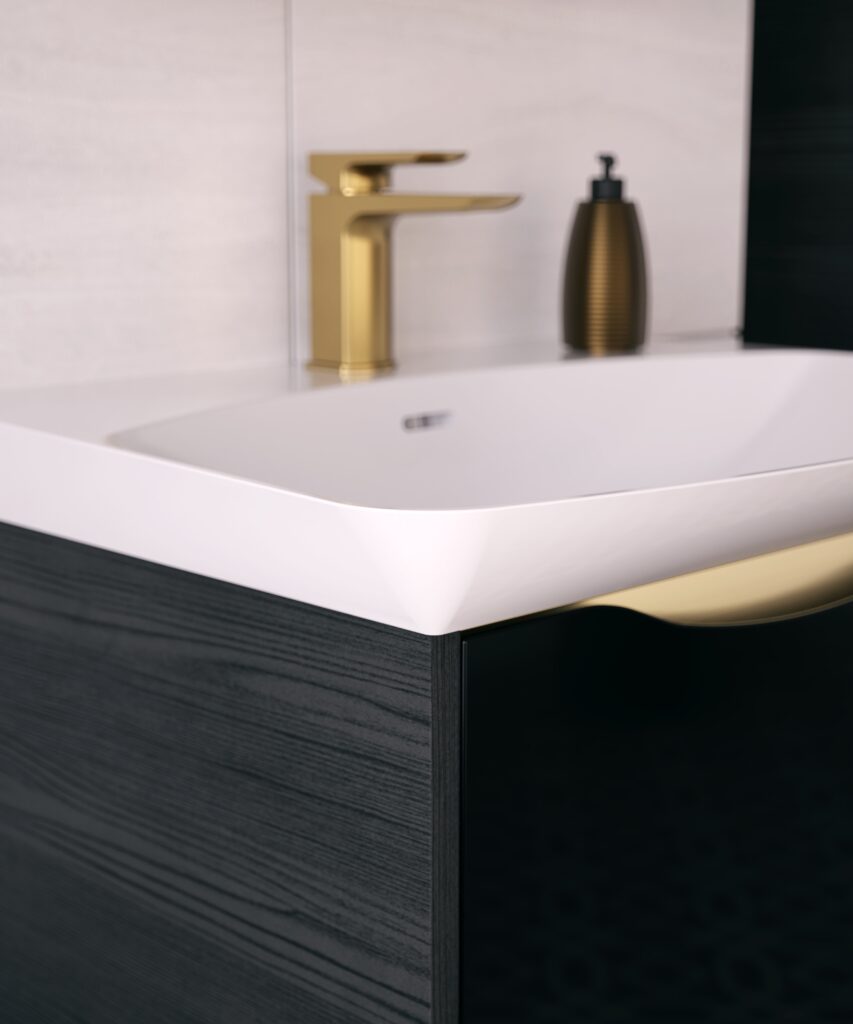 This striking new finish combines a rich wood grain effect on the unit sides with a gleaming plain black glass frontage, creating a dramatic interplay of texture and sheen. The result is a surface that feels as luxurious as it looks, opening up endless new design possibilities for truly distinctive bathrooms.